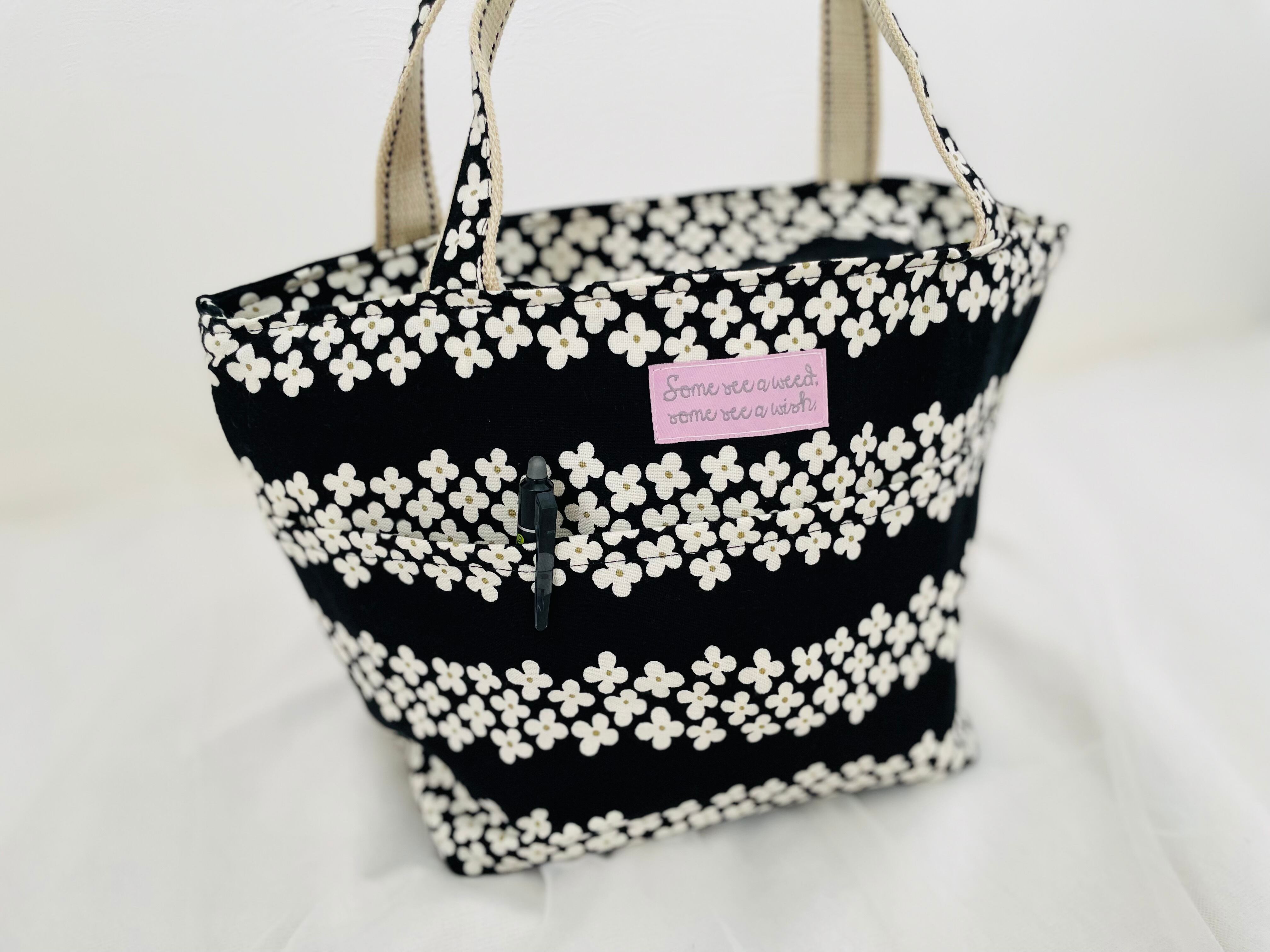 表と裏に柄合わせの深めポケット・中は表地と同じ柄の縁でメッシュポケットがあります。